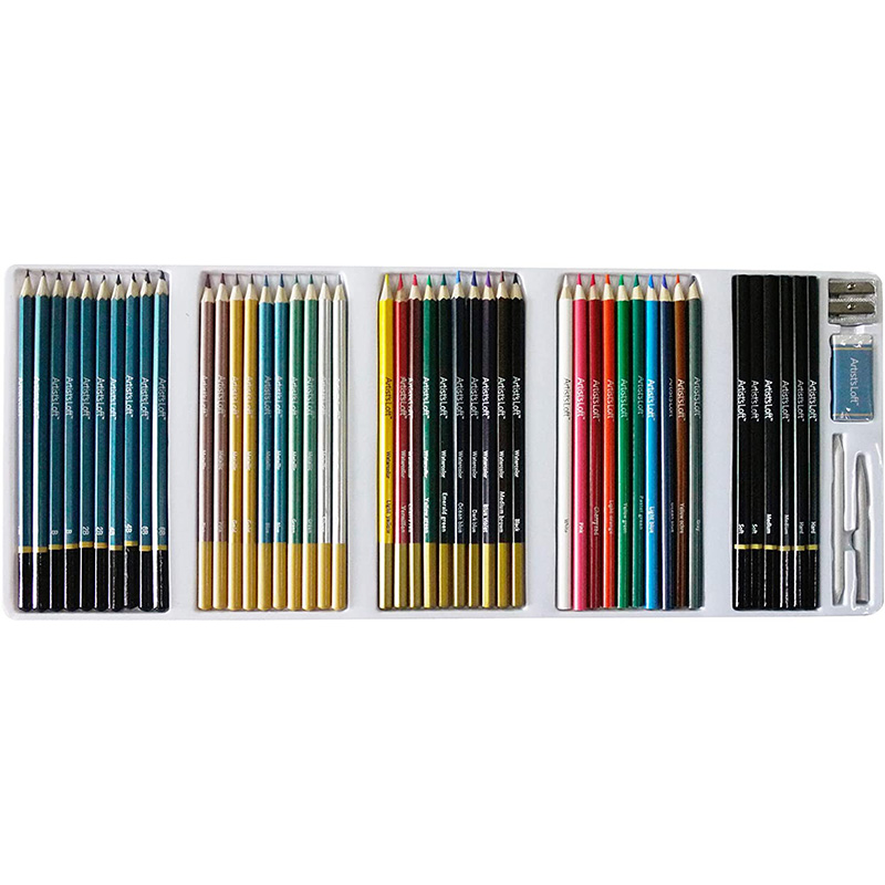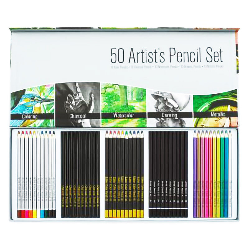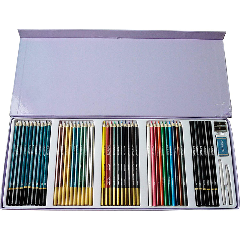 Item No: 74838, Complete Drawing Pencil set: 10 color pencils, 10 watercolor pencils, 10 metallic pencils (2 of each color), 2 HB sketching pencils, 2 B sketching pencils, 2 2B sketching pencils, 2 4B sketching pencils, 2 6B sketching pencils, 2 soft charcoal pencils, 2 medium charcoal pencils, 2 hard charcoal pencils, 1 vinyl eraser, 1 sharpener, 1 stump, 1 tortillon and Color box packaging.